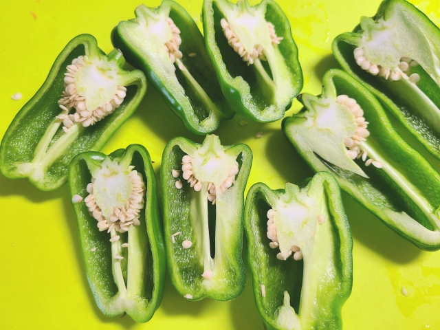 ほんでもってピーマンはこう。ピーマンの色がやばすぎるのは冷蔵庫奥に眠っていた古ピーマンだから。食べ物使い切らず捨てるのほんとやめたい。