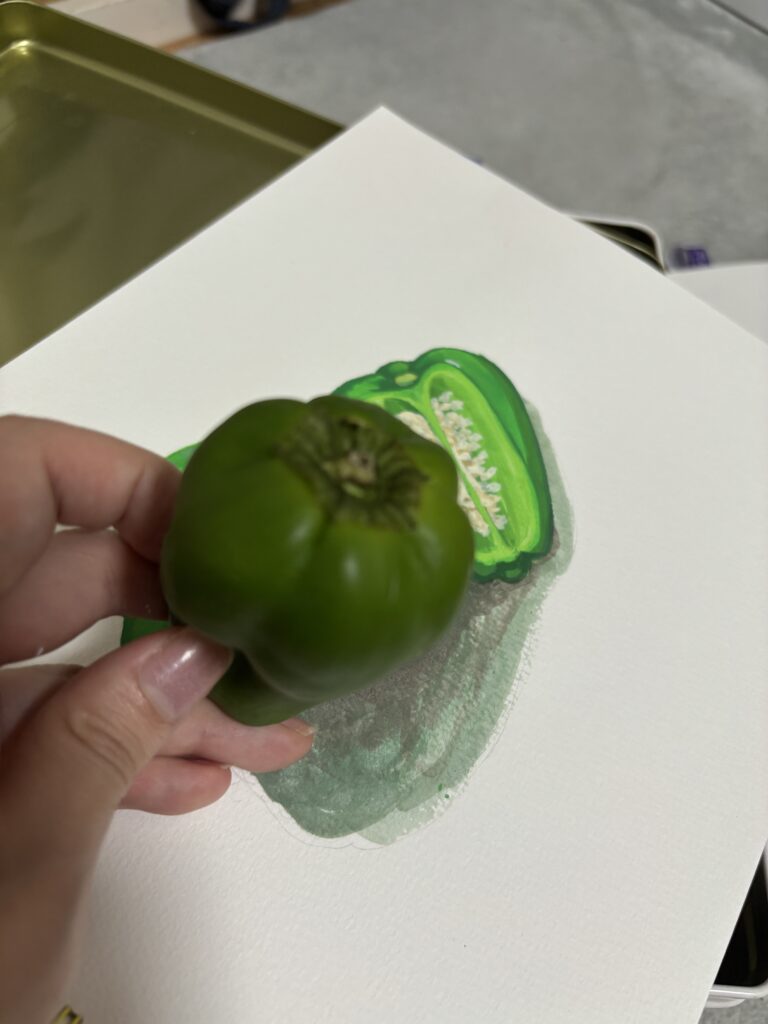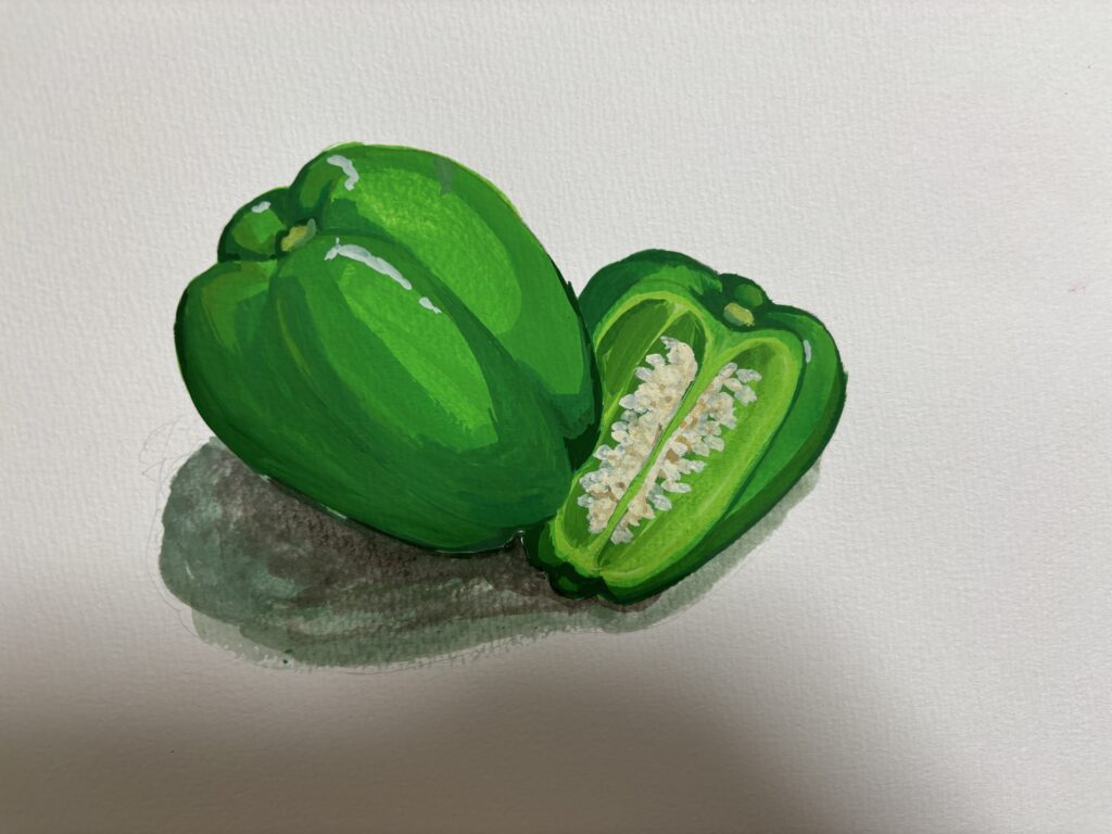 影も正直わからないから、あってほしいところに描いた。ピーマンが浮いてようが重なってようが関係ないのだ。