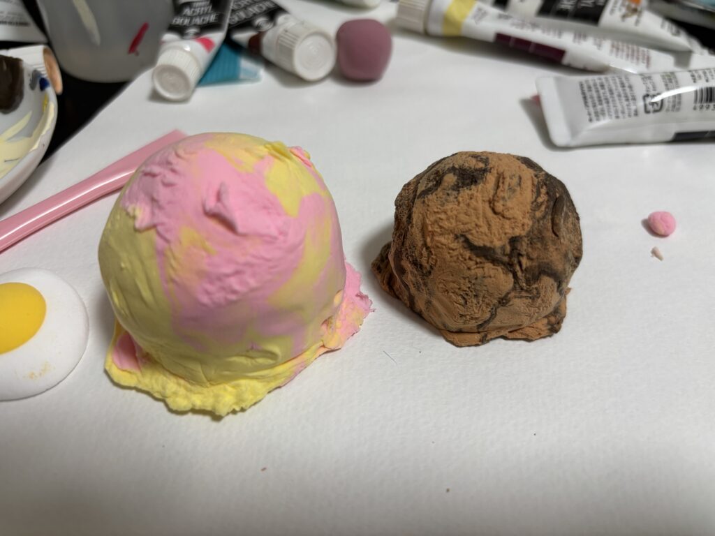 これしばらく乾かしてみます。アイスのスクープを百均で探したけど売ってなくて、手で丸めたからちょい歪。歯ブラシで表面ジャカジャカしたけど歯ブラシが柔らかすぎてちょっとイメージと違ったり。でもなんとなーくアイスになってよかった。